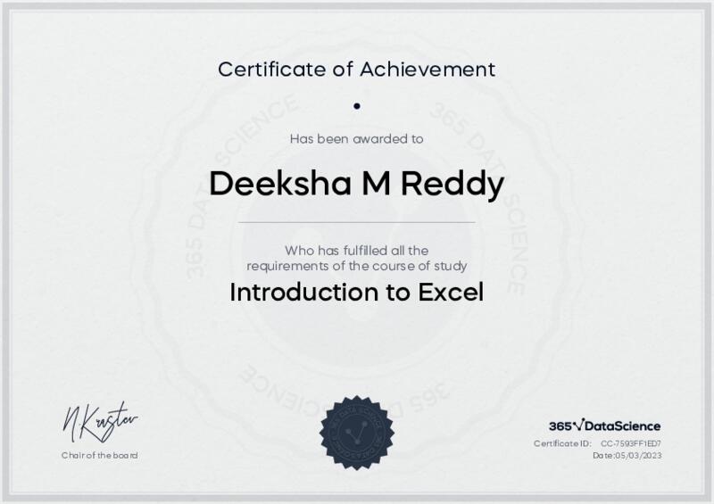This user has been awarded the Introduction to Excel Certificate for successfully completing the course exam. Holding this certificate demonstrates their proficiency on the topic and signifies they are qualified to apply their newly acquired expertise in the fields of data analytics and data science.