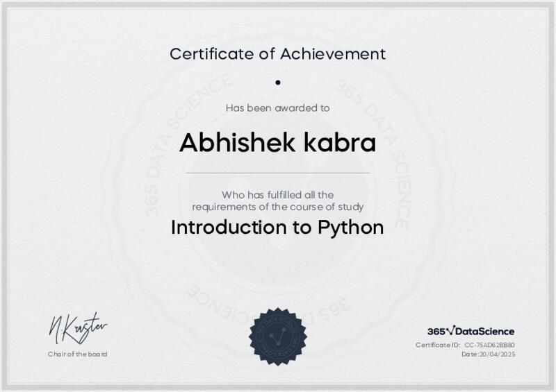 This user has been awarded the Introduction to Python Certificate for successfully completing the course exam. Holding this certificate demonstrates their proficiency on the topic and signifies they are qualified to apply their newly acquired expertise in the fields of data analytics and data science.
