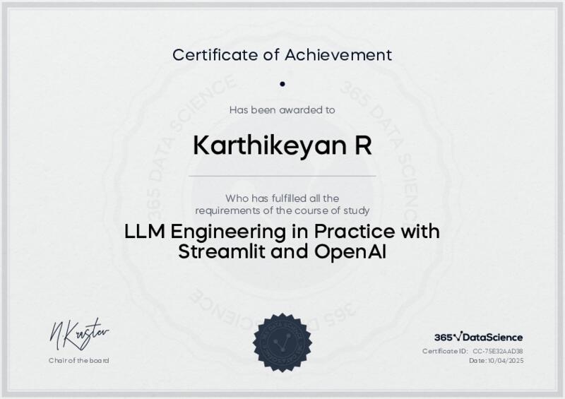 This user has been awarded the LLM Engineering in Practice with Streamlit and OpenAI Certificate for successfully completing the course exam. Holding this certificate demonstrates their proficiency on the topic and signifies they are qualified to apply their newly acquired expertise in the fields of data analytics and data science.