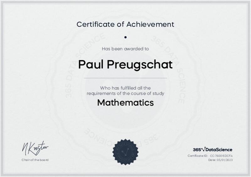 This user has been awarded the Mathematics Certificate for successfully completing the course exam. Holding this certificate demonstrates their proficiency on the topic and signifies they are qualified to apply their newly acquired expertise in the fields of data analytics and data science.