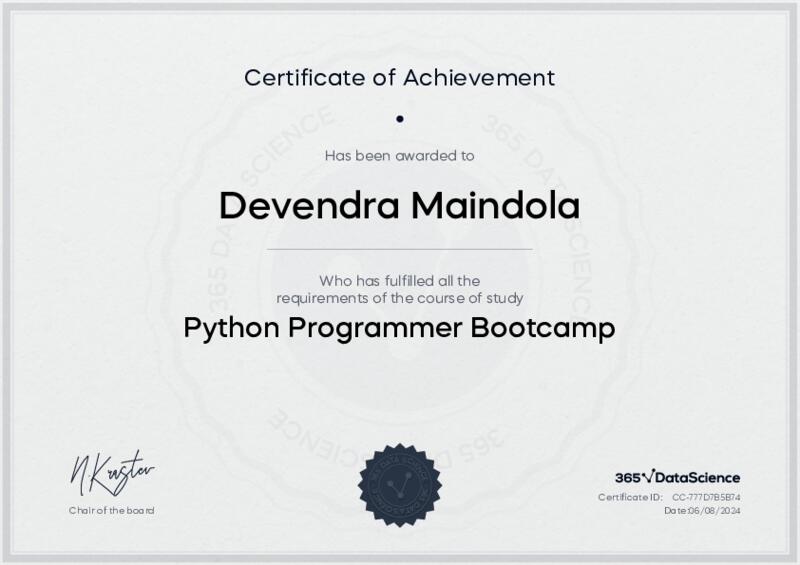 This user has been awarded the Python Programmer Bootcamp Certificate for successfully completing the course exam. Holding this certificate demonstrates their proficiency on the topic and signifies they are qualified to apply their newly acquired expertise in the fields of data analytics and data science.