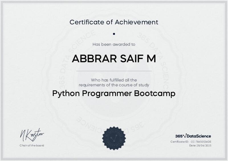 This user has been awarded the Python Programmer Bootcamp Certificate for successfully completing the course exam. Holding this certificate demonstrates their proficiency on the topic and signifies they are qualified to apply their newly acquired expertise in the fields of data analytics and data science.