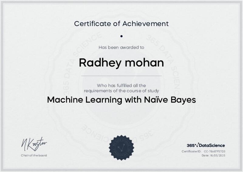 This user has been awarded the Machine Learning with Naïve Bayes Certificate for successfully completing the course exam. Holding this certificate demonstrates their proficiency on the topic and signifies they are qualified to apply their newly acquired expertise in the fields of data analytics and data science.