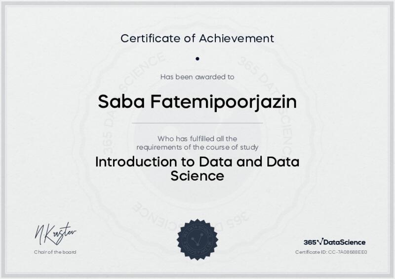 This user has been awarded the Introduction to Data and Data Science Certificate for successfully completing the course exam. Holding this certificate demonstrates their proficiency on the topic and signifies they are qualified to apply their newly acquired expertise in the fields of data analytics and data science.