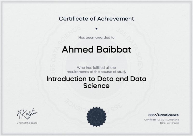 This user has been awarded the Introduction to Data and Data Science Certificate for successfully completing the course exam. Holding this certificate demonstrates their proficiency on the topic and signifies they are qualified to apply their newly acquired expertise in the fields of data analytics and data science.