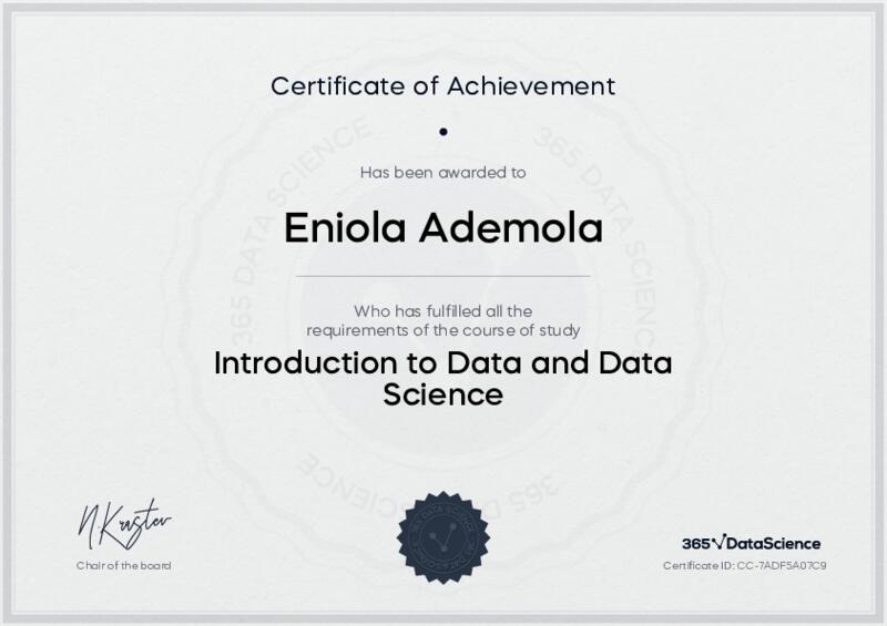 This user has been awarded the Introduction to Data and Data Science Certificate for successfully completing the course exam. Holding this certificate demonstrates their proficiency on the topic and signifies they are qualified to apply their newly acquired expertise in the fields of data analytics and data science.