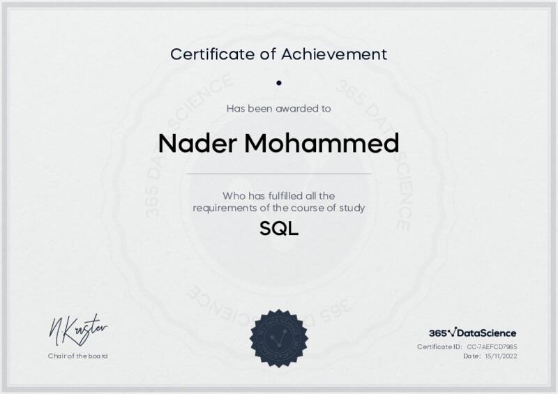 This user has been awarded the SQL Certificate for successfully completing the course exam. Holding this certificate demonstrates their proficiency on the topic and signifies they are qualified to apply their newly acquired expertise in the fields of data analytics and data science.