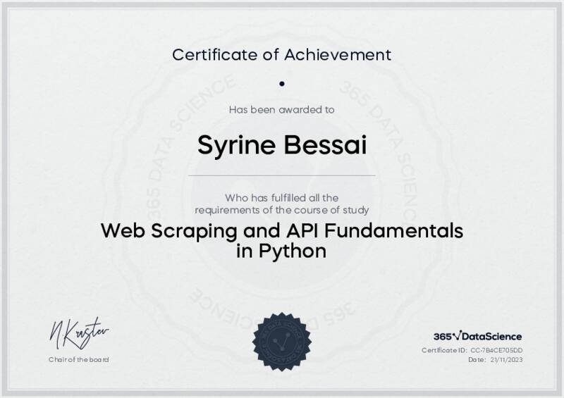 This user has been awarded the Web Scraping and API Fundamentals in Python Certificate for successfully completing the course exam. Holding this certificate demonstrates their proficiency on the topic and signifies they are qualified to apply their newly acquired expertise in the fields of data analytics and data science.