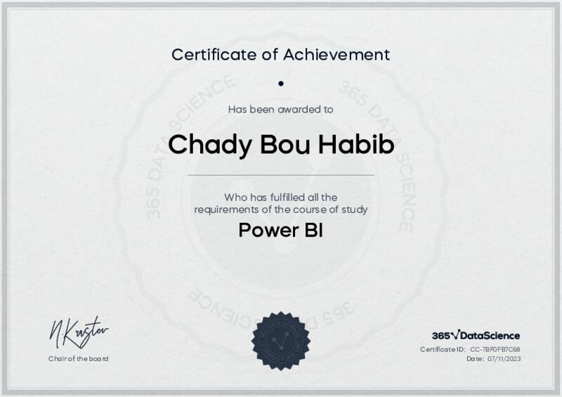 This user has been awarded the Power BI Certificate for successfully completing the course exam. Holding this certificate demonstrates their proficiency on the topic and signifies they are qualified to apply their newly acquired expertise in the fields of data analytics and data science.