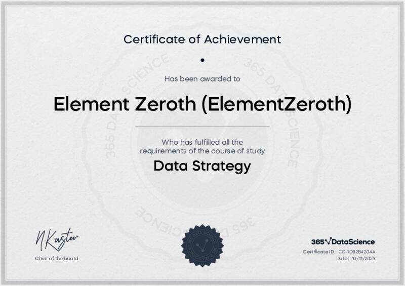 This user has been awarded the Data Strategy Certificate for successfully completing the course exam. Holding this certificate demonstrates their proficiency on the topic and signifies they are qualified to apply their newly acquired expertise in the fields of data analytics and data science.