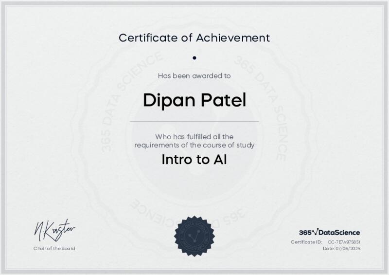 This user has been awarded the Intro to AI Certificate for successfully completing the course exam. Holding this certificate demonstrates their proficiency on the topic and signifies they are qualified to apply their newly acquired expertise in the fields of data analytics and data science.