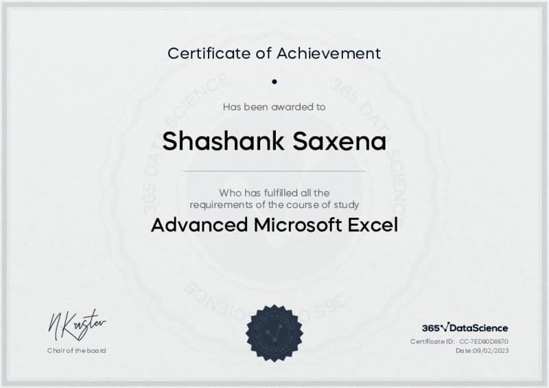 This user has been awarded the Advanced Microsoft Excel Certificate for successfully completing the course exam. Holding this certificate demonstrates their proficiency on the topic and signifies they are qualified to apply their newly acquired expertise in the fields of data analytics and data science.