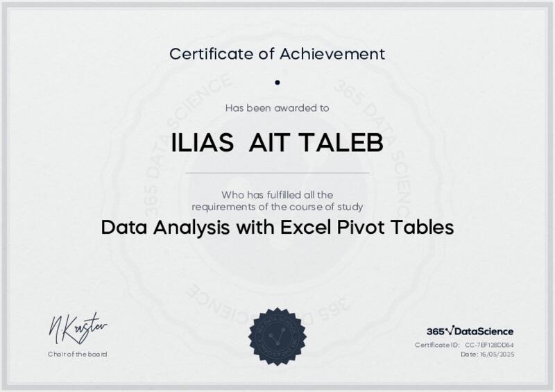 This user has been awarded the Data Analysis with Excel Pivot Tables Certificate for successfully completing the course exam. Holding this certificate demonstrates their proficiency on the topic and signifies they are qualified to apply their newly acquired expertise in the fields of data analytics and data science.
