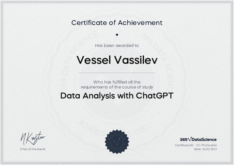 This user has been awarded the Data Analysis with ChatGPT Certificate for successfully completing the course exam. Holding this certificate demonstrates their proficiency on the topic and signifies they are qualified to apply their newly acquired expertise in the fields of data analytics and data science.