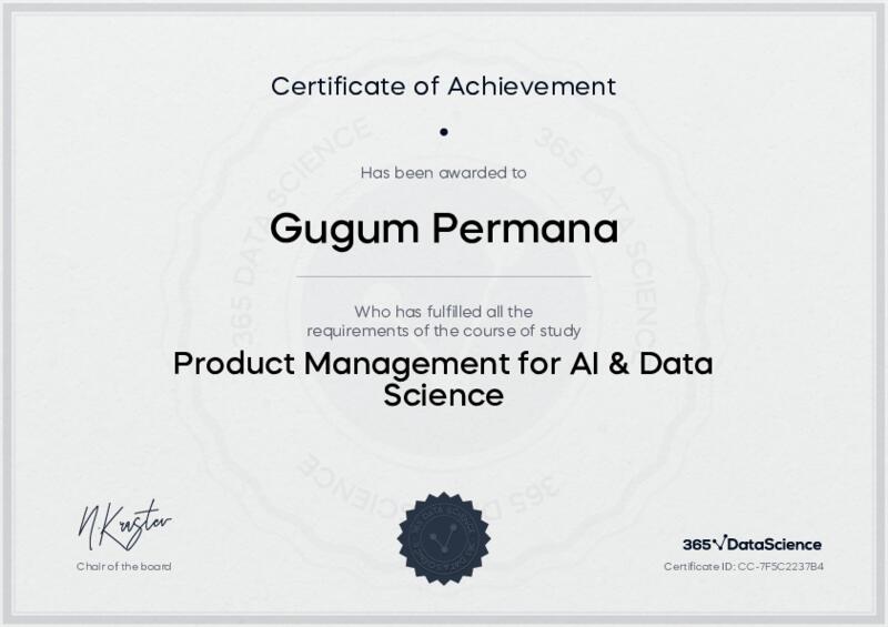 This user has been awarded the Product Management for AI & Data Science Certificate for successfully completing the course exam. Holding this certificate demonstrates their proficiency on the topic and signifies they are qualified to apply their newly acquired expertise in the fields of data analytics and data science.