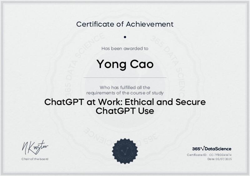 This user has been awarded the ChatGPT at Work: Ethical and Secure ChatGPT Use Certificate for successfully completing the course exam. Holding this certificate demonstrates their proficiency on the topic and signifies they are qualified to apply their newly acquired expertise in the fields of data analytics and data science.
