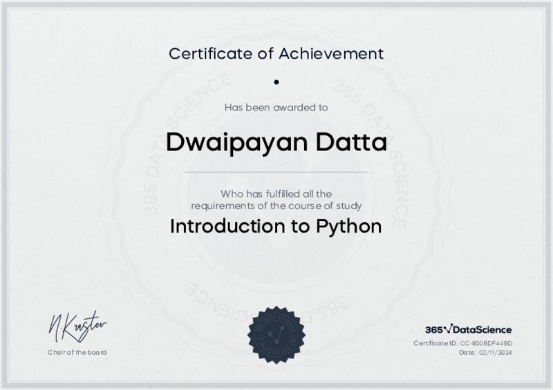 This user has been awarded the Introduction to Python Certificate for successfully completing the course exam. Holding this certificate demonstrates their proficiency on the topic and signifies they are qualified to apply their newly acquired expertise in the fields of data analytics and data science.