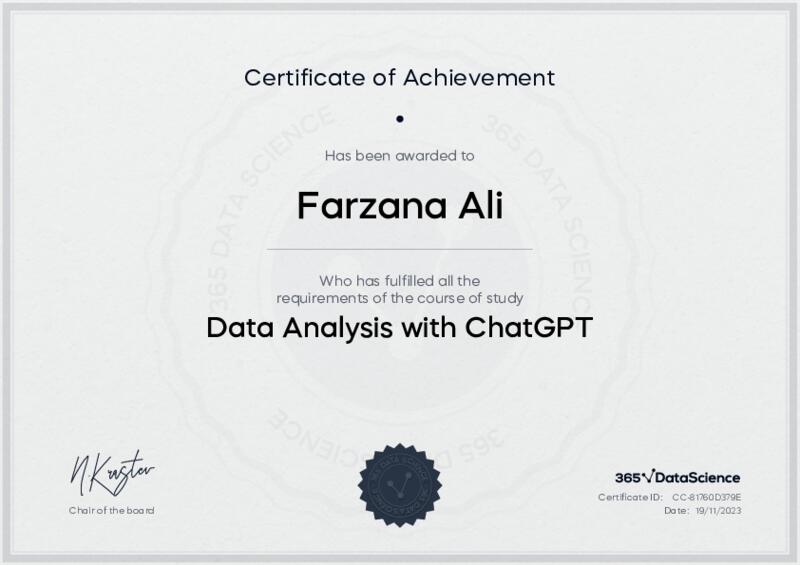 This user has been awarded the Data Analysis with ChatGPT Certificate for successfully completing the course exam. Holding this certificate demonstrates their proficiency on the topic and signifies they are qualified to apply their newly acquired expertise in the fields of data analytics and data science.