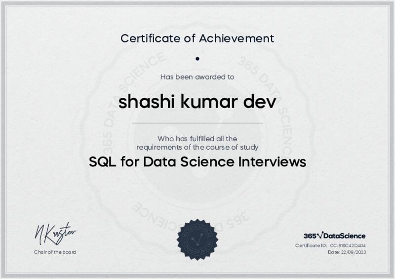 This user has been awarded the SQL for Data Science Interviews Certificate for successfully completing the course exam. Holding this certificate demonstrates their proficiency on the topic and signifies they are qualified to apply their newly acquired expertise in the fields of data analytics and data science.