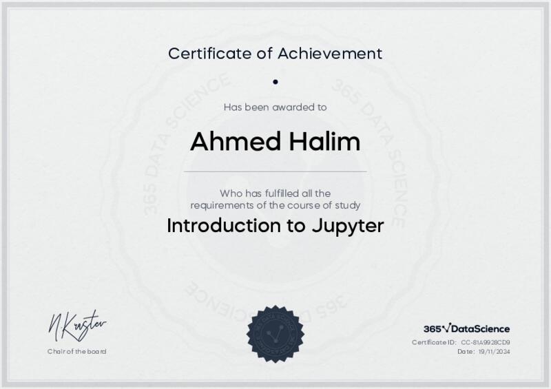 This user has been awarded the Introduction to Jupyter Certificate for successfully completing the course exam. Holding this certificate demonstrates their proficiency on the topic and signifies they are qualified to apply their newly acquired expertise in the fields of data analytics and data science.