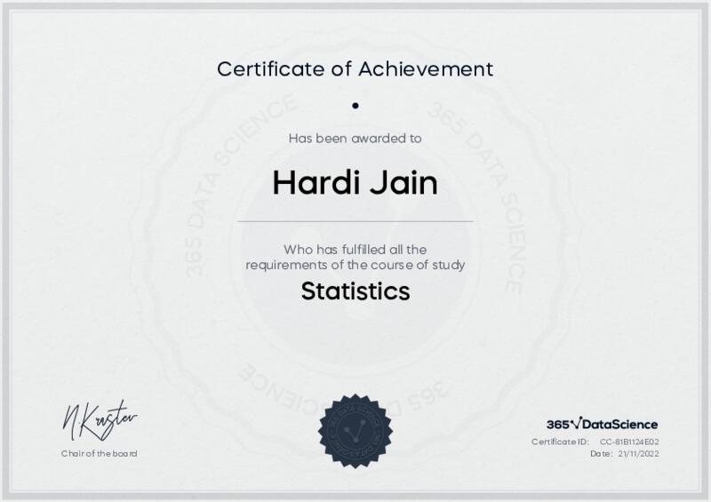 This user has been awarded the Statistics Certificate for successfully completing the course exam. Holding this certificate demonstrates their proficiency on the topic and signifies they are qualified to apply their newly acquired expertise in the fields of data analytics and data science.