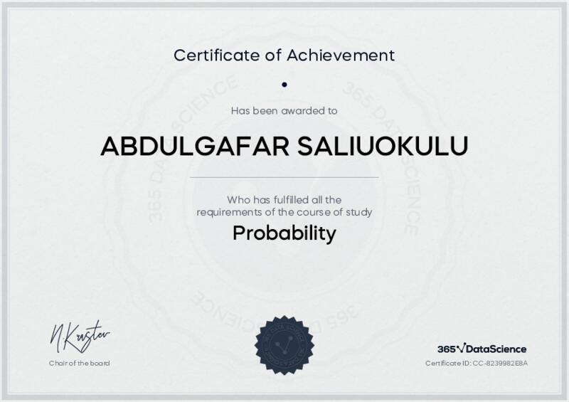 This user has been awarded the Probability Certificate for successfully completing the course exam. Holding this certificate demonstrates their proficiency on the topic and signifies they are qualified to apply their newly acquired expertise in the fields of data analytics and data science.