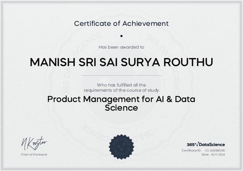 This user has been awarded the Product Management for AI & Data Science Certificate for successfully completing the course exam. Holding this certificate demonstrates their proficiency on the topic and signifies they are qualified to apply their newly acquired expertise in the fields of data analytics and data science.