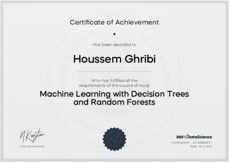 This user has been awarded the Machine Learning with Decision Trees and Random Forests Certificate for successfully completing the course exam. Holding this certificate demonstrates their proficiency on the topic and signifies they are qualified to apply their newly acquired expertise in the fields of data analytics and data science.