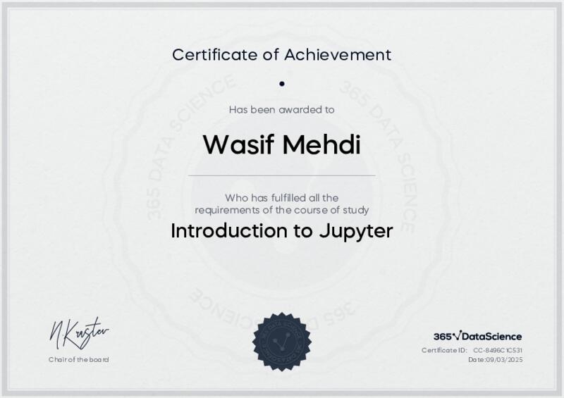 This user has been awarded the Introduction to Jupyter Certificate for successfully completing the course exam. Holding this certificate demonstrates their proficiency on the topic and signifies they are qualified to apply their newly acquired expertise in the fields of data analytics and data science.