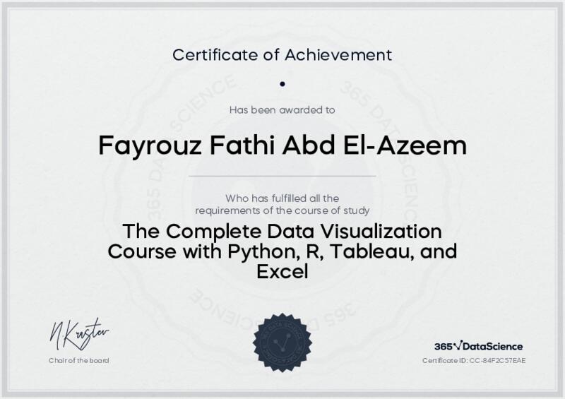 This user has been awarded the The Complete Data Visualization Course with Python, R, Tableau, and Excel Certificate for successfully completing the course exam. Holding this certificate demonstrates their proficiency on the topic and signifies they are qualified to apply their newly acquired expertise in the fields of data analytics and data science.