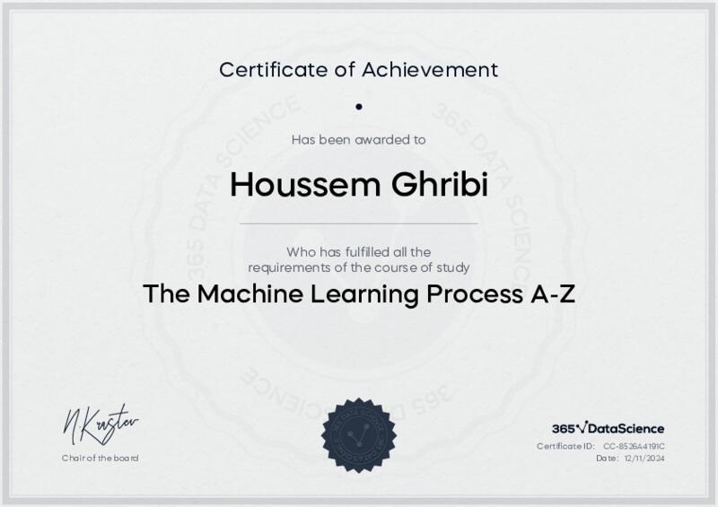 This user has been awarded the The Machine Learning Process A-Z Certificate for successfully completing the course exam. Holding this certificate demonstrates their proficiency on the topic and signifies they are qualified to apply their newly acquired expertise in the fields of data analytics and data science.