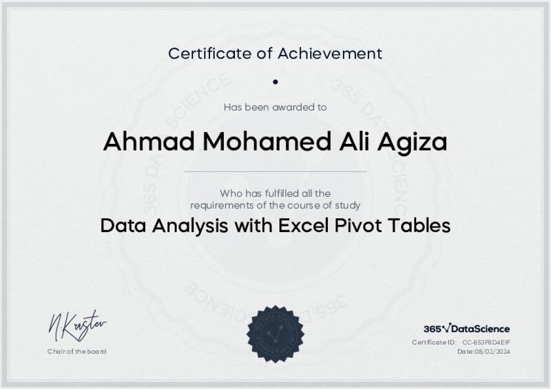 This user has been awarded the Data Analysis with Excel Pivot Tables Certificate for successfully completing the course exam. Holding this certificate demonstrates their proficiency on the topic and signifies they are qualified to apply their newly acquired expertise in the fields of data analytics and data science.