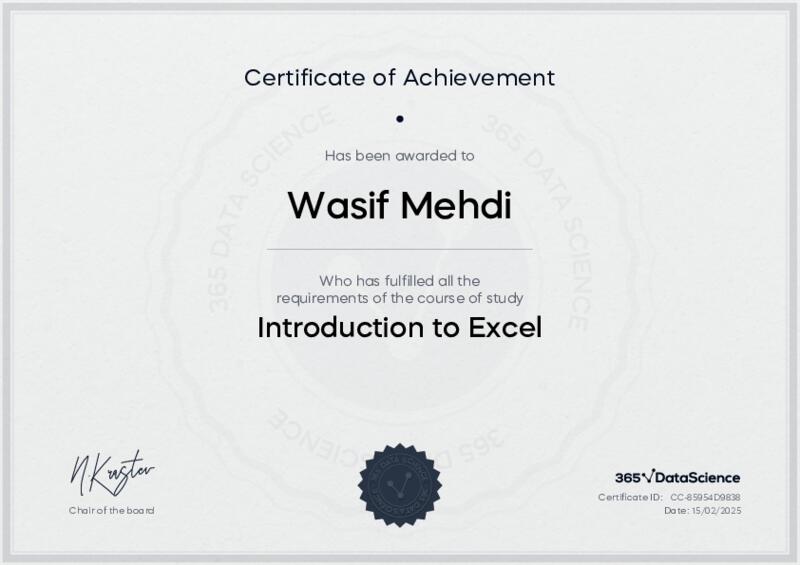 This user has been awarded the Introduction to Excel Certificate for successfully completing the course exam. Holding this certificate demonstrates their proficiency on the topic and signifies they are qualified to apply their newly acquired expertise in the fields of data analytics and data science.