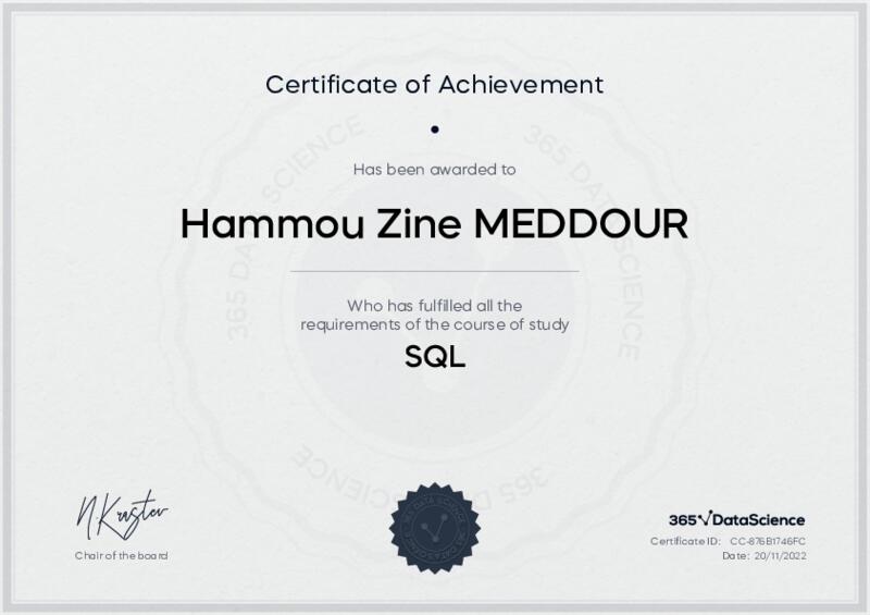 This user has been awarded the SQL Certificate for successfully completing the course exam. Holding this certificate demonstrates their proficiency on the topic and signifies they are qualified to apply their newly acquired expertise in the fields of data analytics and data science.
