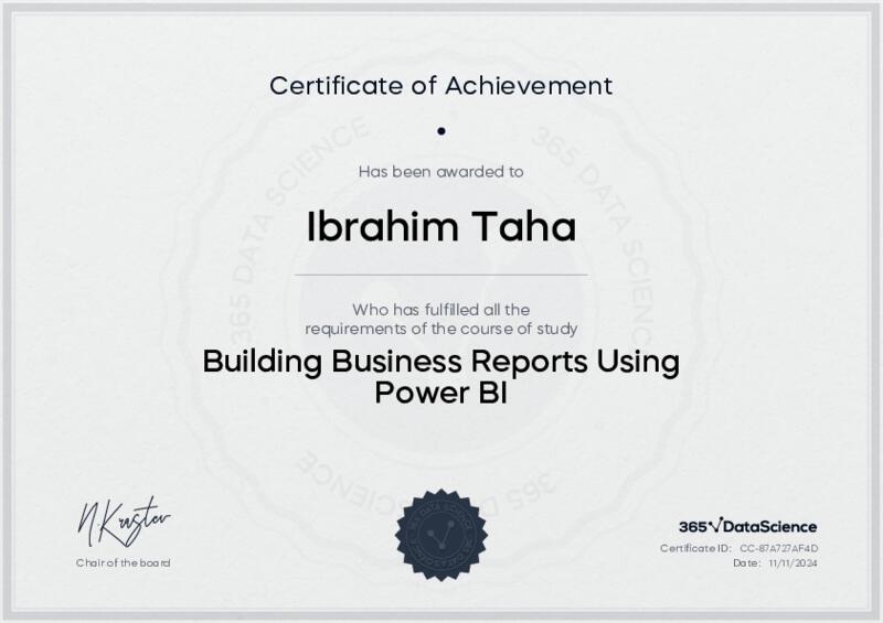 This user has been awarded the Building Business Reports Using Power BI Certificate for successfully completing the course exam. Holding this certificate demonstrates their proficiency on the topic and signifies they are qualified to apply their newly acquired expertise in the fields of data analytics and data science.
