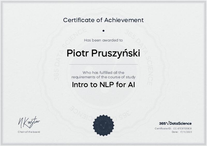 This user has been awarded the Intro to NLP for AI Certificate for successfully completing the course exam. Holding this certificate demonstrates their proficiency on the topic and signifies they are qualified to apply their newly acquired expertise in the fields of data analytics and data science.