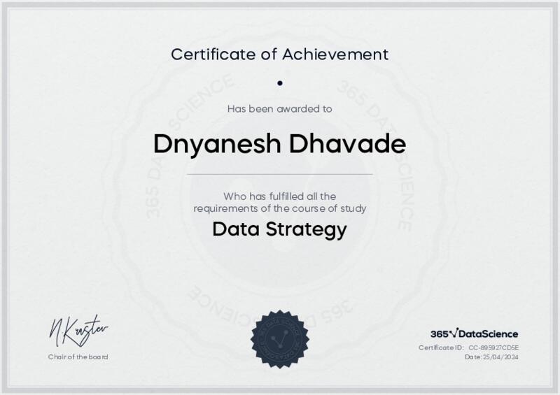 This user has been awarded the Data Strategy Certificate for successfully completing the course exam. Holding this certificate demonstrates their proficiency on the topic and signifies they are qualified to apply their newly acquired expertise in the fields of data analytics and data science.