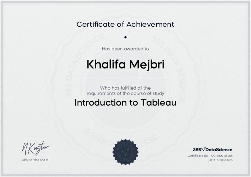 This user has been awarded the Introduction to Tableau Certificate for successfully completing the course exam. Holding this certificate demonstrates their proficiency on the topic and signifies they are qualified to apply their newly acquired expertise in the fields of data analytics and data science.
