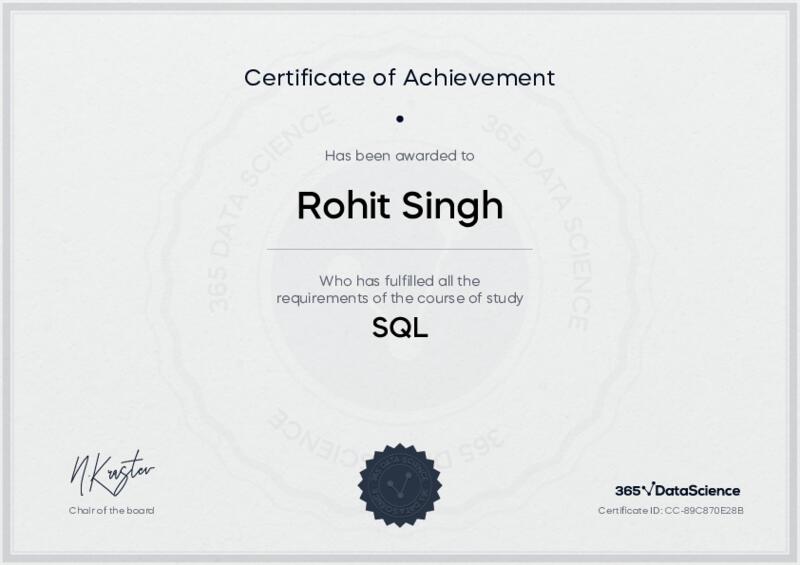 This user has been awarded the SQL Certificate for successfully completing the course exam. Holding this certificate demonstrates their proficiency on the topic and signifies they are qualified to apply their newly acquired expertise in the fields of data analytics and data science.