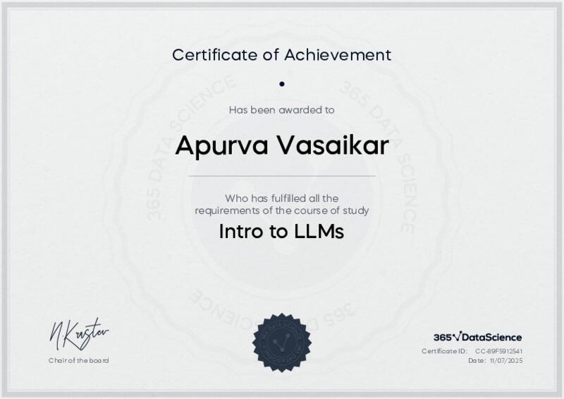 This user has been awarded the Intro to LLMs Certificate for successfully completing the course exam. Holding this certificate demonstrates their proficiency on the topic and signifies they are qualified to apply their newly acquired expertise in the fields of data analytics and data science.