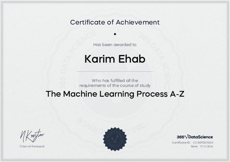 This user has been awarded the The Machine Learning Process A-Z Certificate for successfully completing the course exam. Holding this certificate demonstrates their proficiency on the topic and signifies they are qualified to apply their newly acquired expertise in the fields of data analytics and data science.