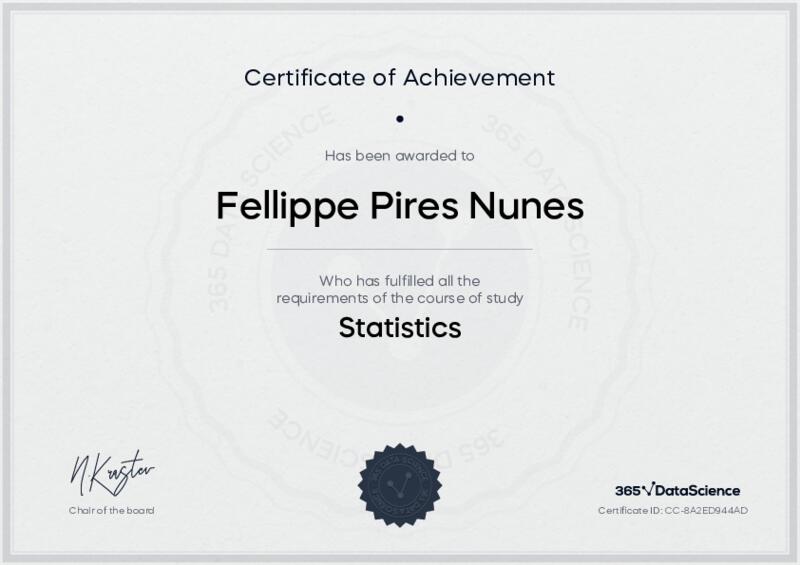 This user has been awarded the Statistics Certificate for successfully completing the course exam. Holding this certificate demonstrates their proficiency on the topic and signifies they are qualified to apply their newly acquired expertise in the fields of data analytics and data science.