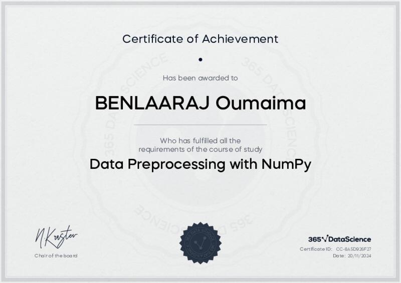 This user has been awarded the Data Preprocessing with NumPy Certificate for successfully completing the course exam. Holding this certificate demonstrates their proficiency on the topic and signifies they are qualified to apply their newly acquired expertise in the fields of data analytics and data science.
