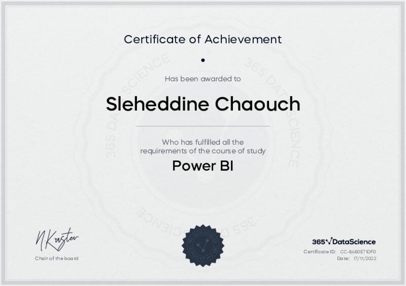 This user has been awarded the Power BI Certificate for successfully completing the course exam. Holding this certificate demonstrates their proficiency on the topic and signifies they are qualified to apply their newly acquired expertise in the fields of data analytics and data science.