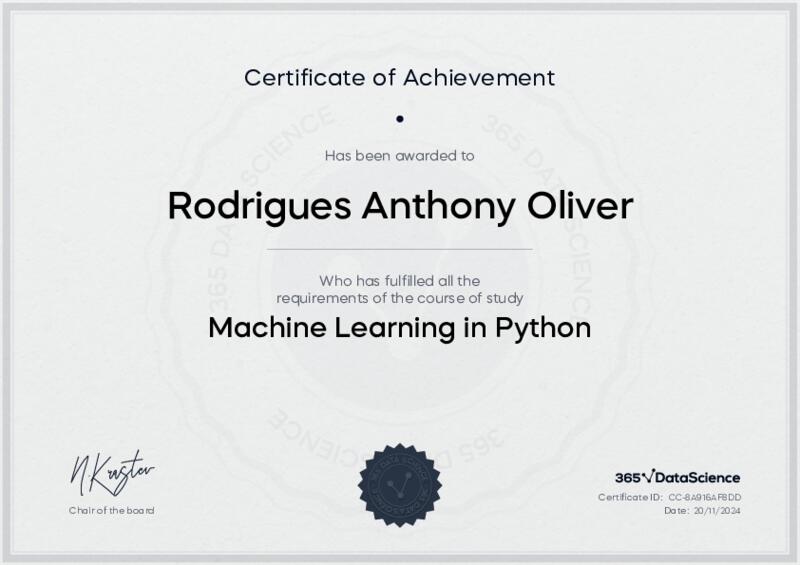 This user has been awarded the Machine Learning in Python Certificate for successfully completing the course exam. Holding this certificate demonstrates their proficiency on the topic and signifies they are qualified to apply their newly acquired expertise in the fields of data analytics and data science.