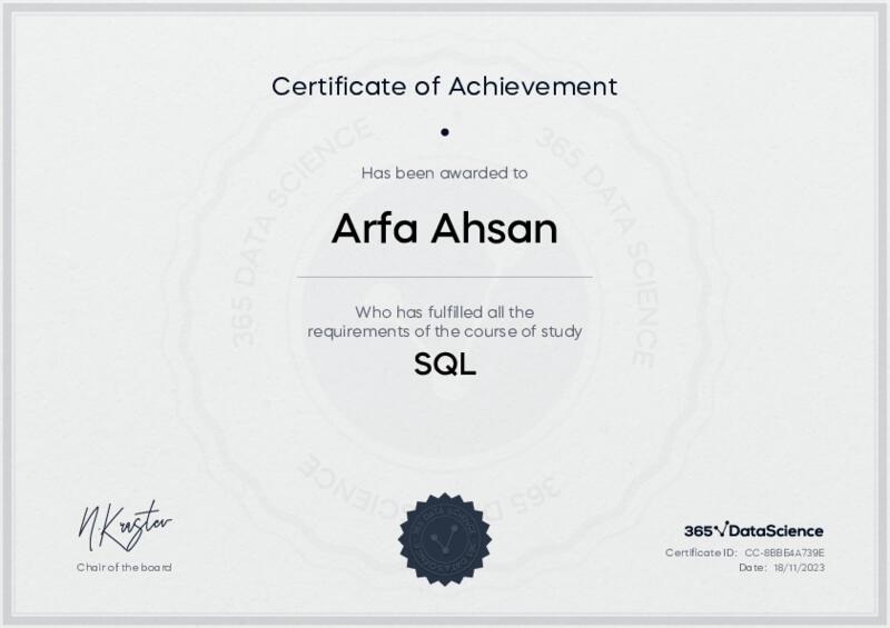 This user has been awarded the SQL Certificate for successfully completing the course exam. Holding this certificate demonstrates their proficiency on the topic and signifies they are qualified to apply their newly acquired expertise in the fields of data analytics and data science.