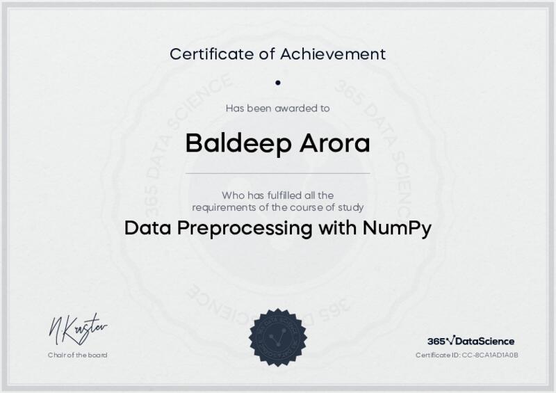 This user has been awarded the Data Preprocessing with NumPy Certificate for successfully completing the course exam. Holding this certificate demonstrates their proficiency on the topic and signifies they are qualified to apply their newly acquired expertise in the fields of data analytics and data science.