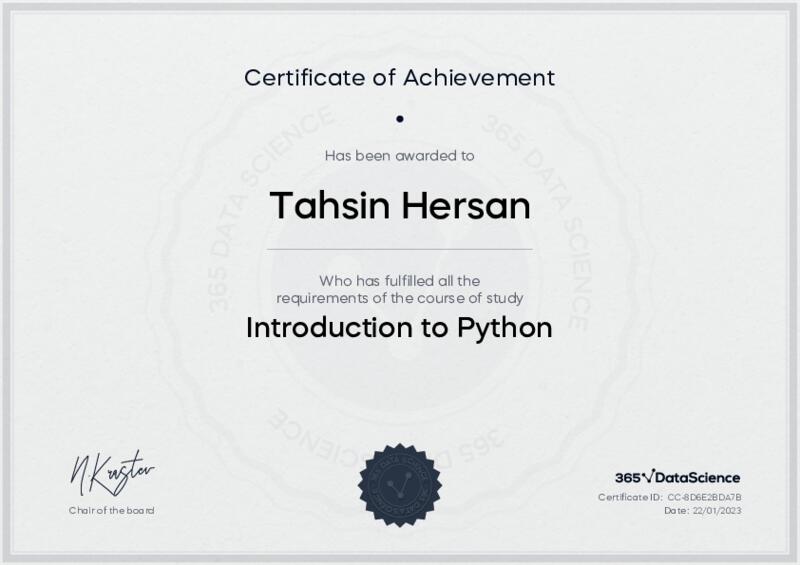 This user has been awarded the Introduction to Python Certificate for successfully completing the course exam. Holding this certificate demonstrates their proficiency on the topic and signifies they are qualified to apply their newly acquired expertise in the fields of data analytics and data science.