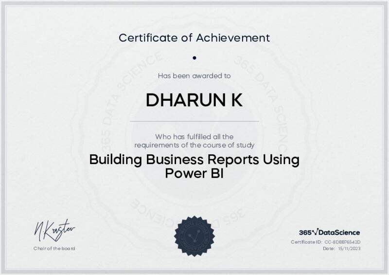 This user has been awarded the Building Business Reports Using Power BI Certificate for successfully completing the course exam. Holding this certificate demonstrates their proficiency on the topic and signifies they are qualified to apply their newly acquired expertise in the fields of data analytics and data science.