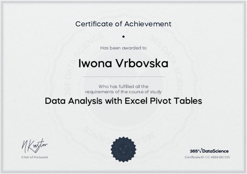 This user has been awarded the Data Analysis with Excel Pivot Tables Certificate for successfully completing the course exam. Holding this certificate demonstrates their proficiency on the topic and signifies they are qualified to apply their newly acquired expertise in the fields of data analytics and data science.